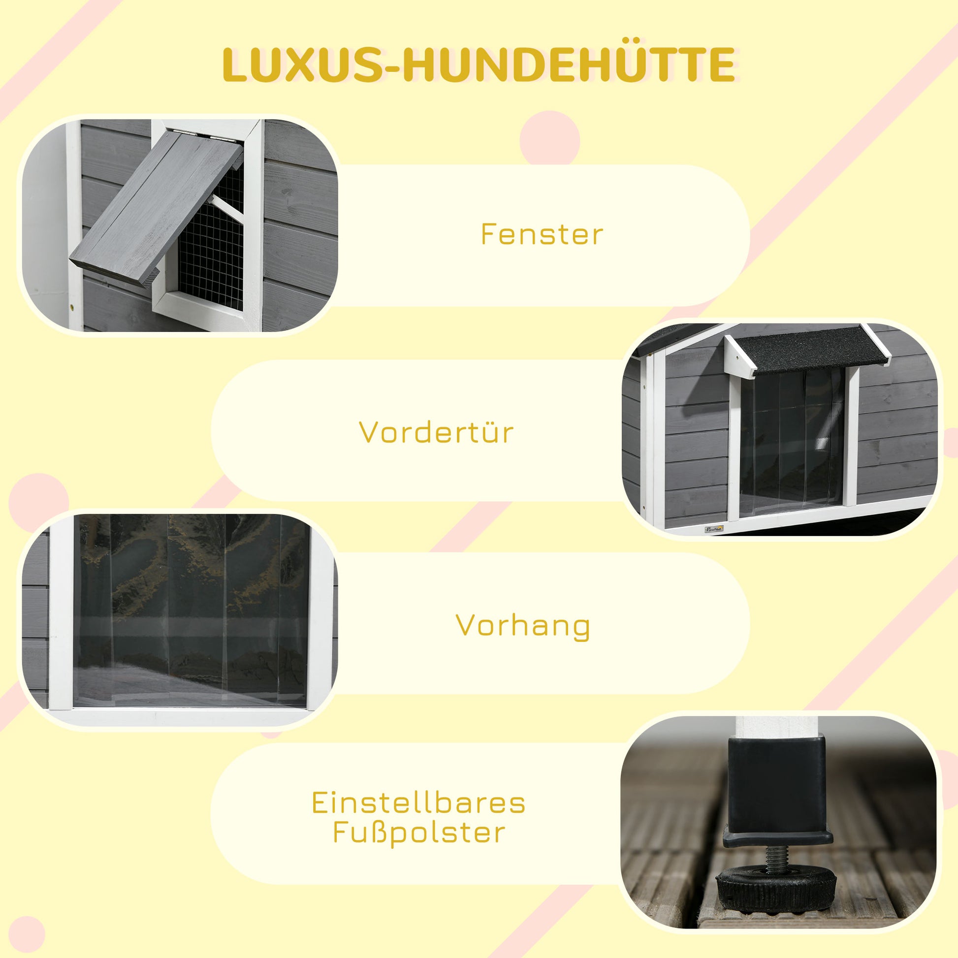 PawHut Hundehütte aus Massivholz, wetterbeständig, Asphaltdach, abnehmbarer Boden, 109 cm x 79 cm x 72 cm, Grau + Weiß