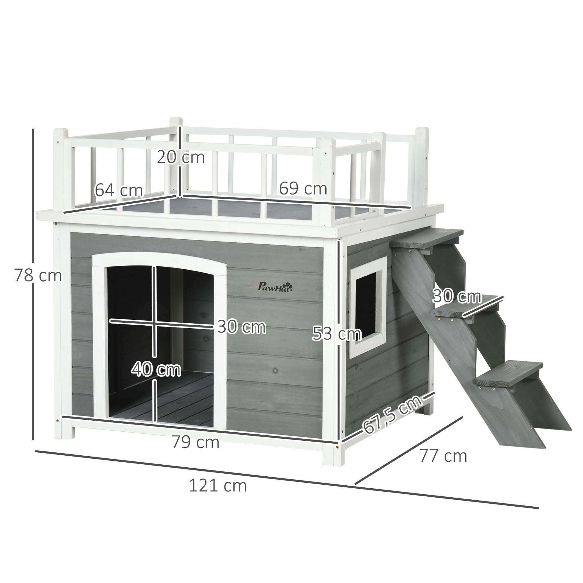 PawHut Hundehütte, Dachterrasse, Treppe, Fenster, Bodenabstand, Naturholz, hellgrau, 121 x 77 x 78cm