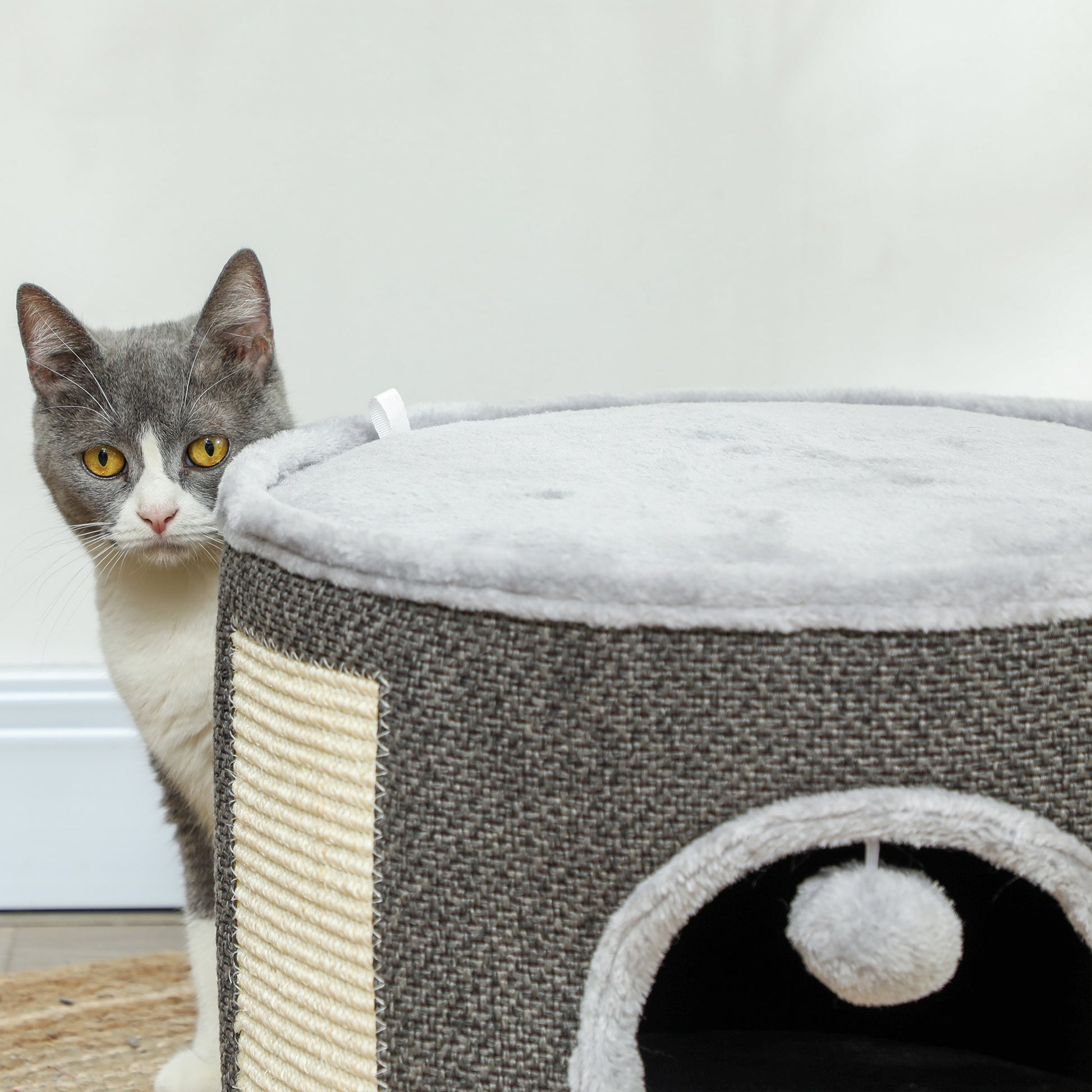 PawHut Katzenhöhle, 2 Etagen, Katzenhaus, Plüsch, Kissen, Sisal-Kratzbrett, Φ40 x 30H cm, Dunkelgrau