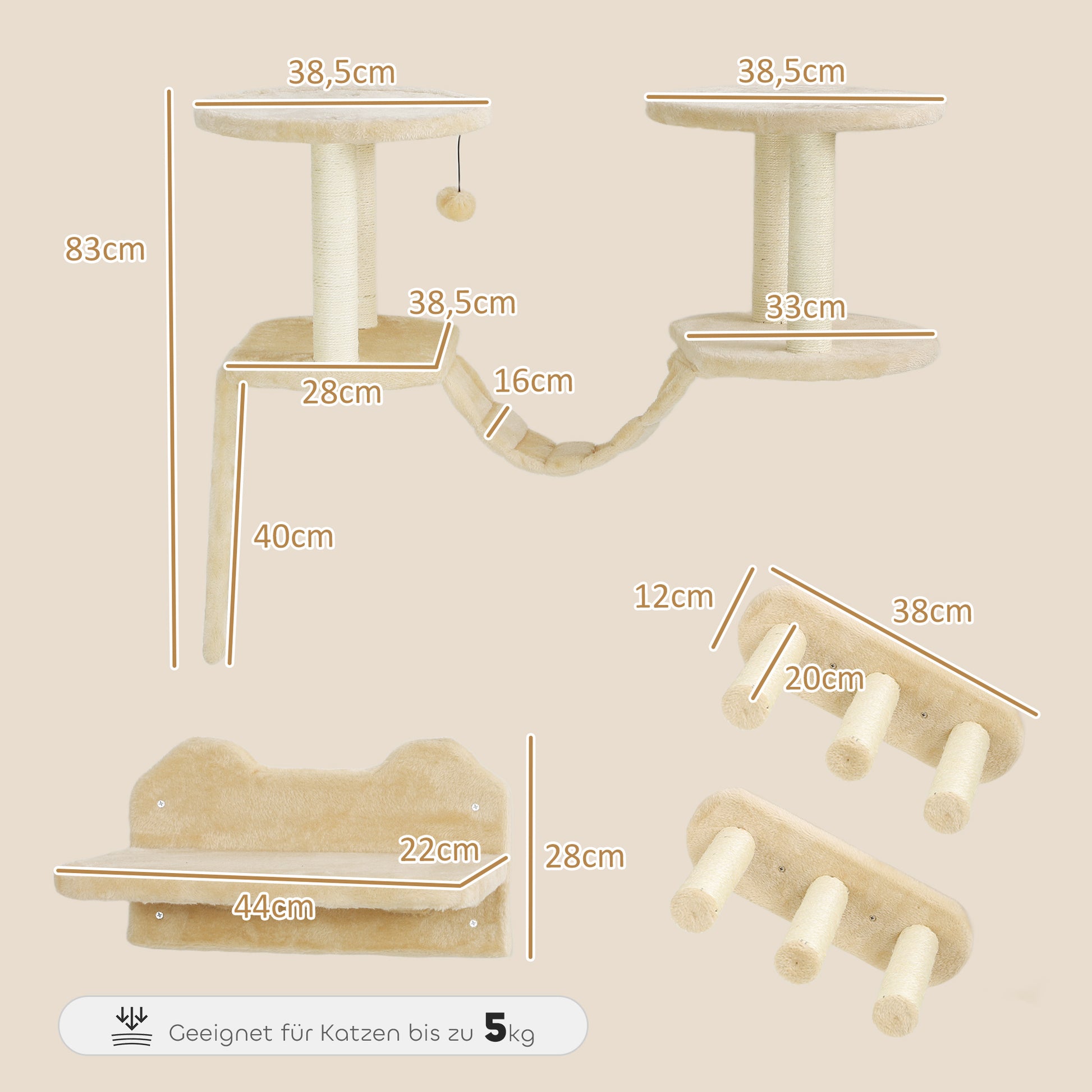 PawHut Katzentreppen-Set, Wand- och Deckenmontage, för Katzen till 5 kg, Beige