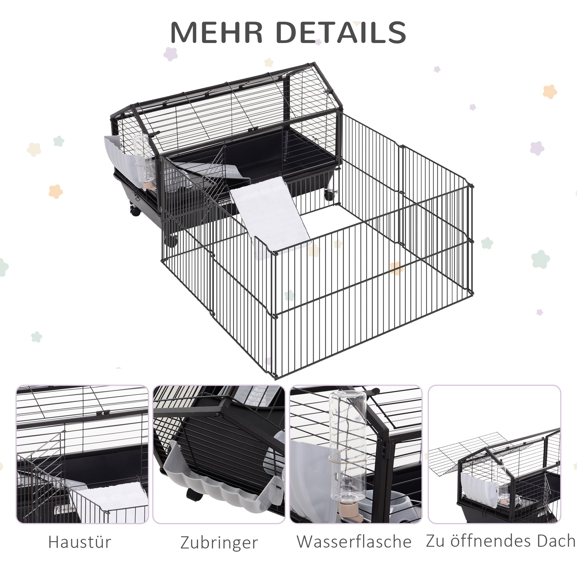 Pawhut Kleintierkäfig mit Freigehege inkl. Zubehör 88 cm x 128,5 cm x 56 cm 4 Rollen Schwarz Metall Polypropylen