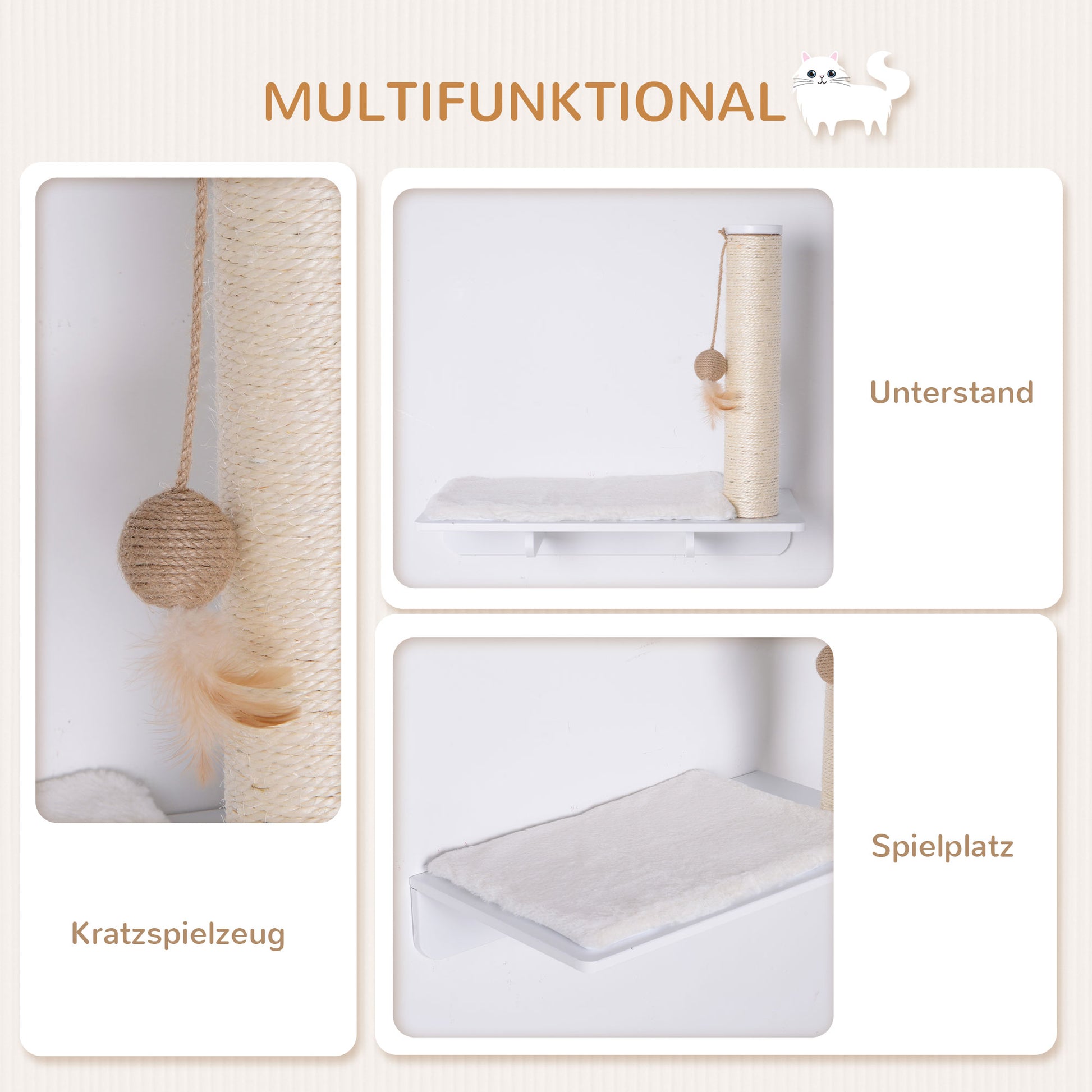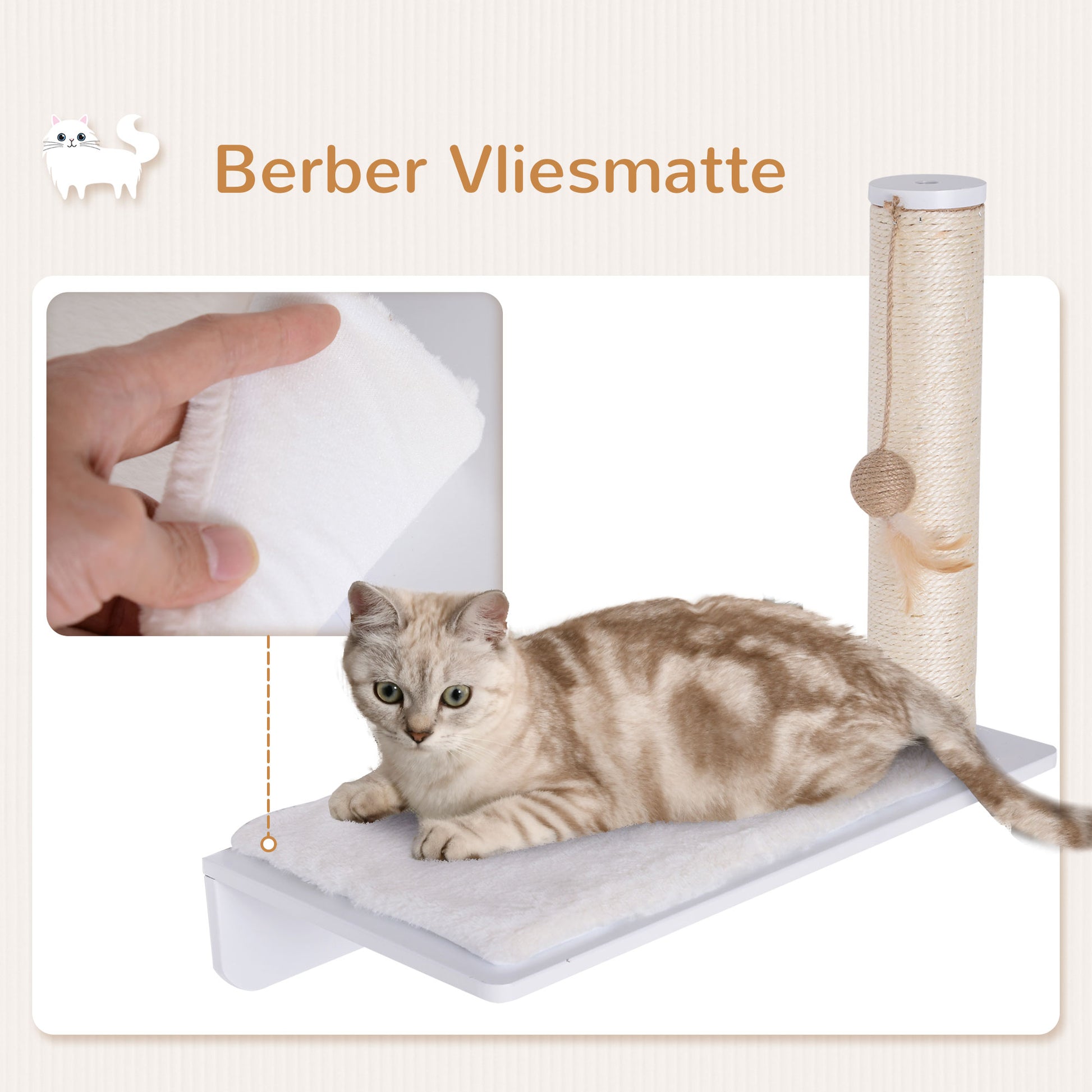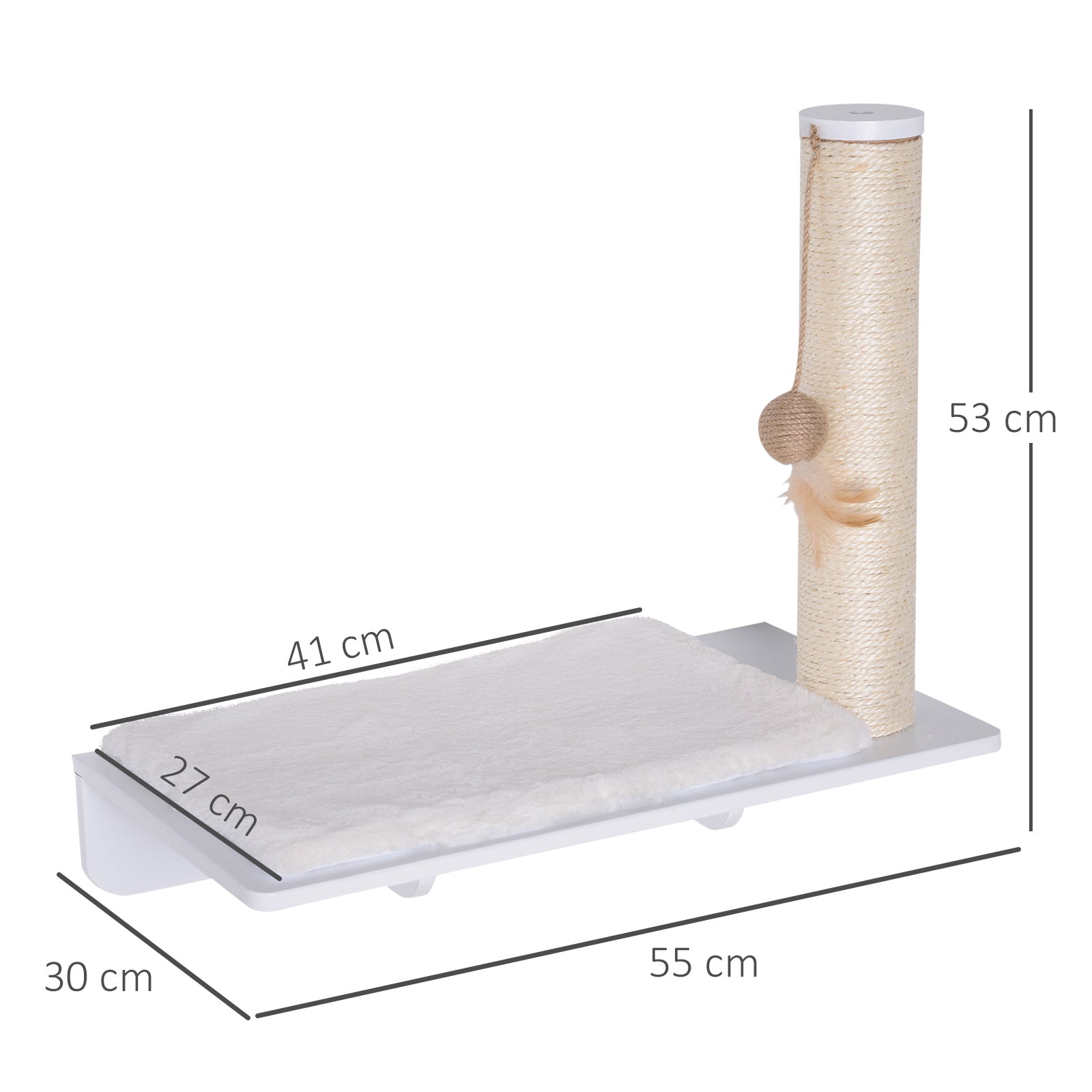 PawHut Kletterwand Katzen, Wandkratzbaum, Katzenliege mit Kratzbaum,53cm Katzenregal mit Ballspielzeug, Plüschauflage, Katzenkratzbaum, Katzensäule, Weiß