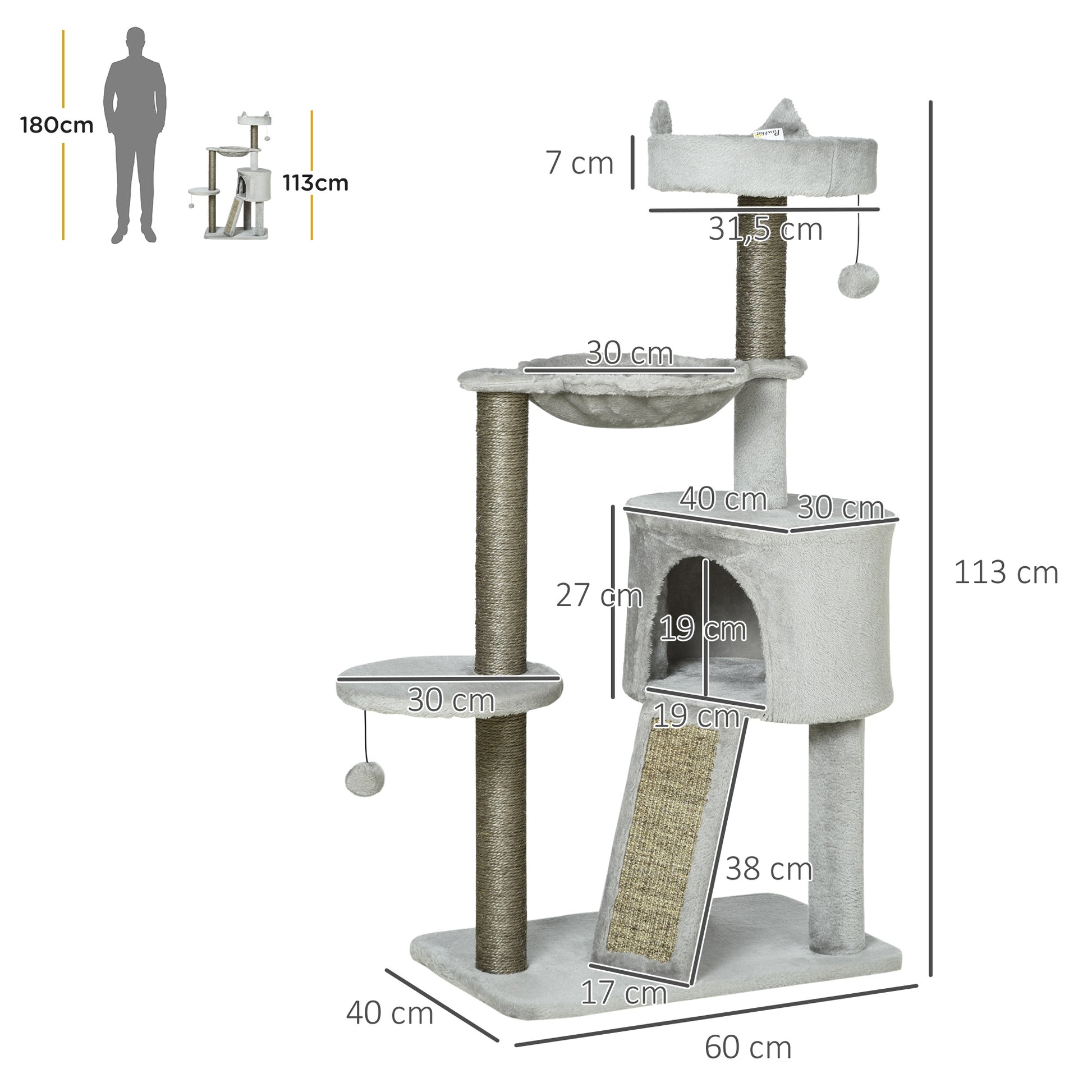 Pawhut Kratzbaum inkl. Katzenhöhle, Katzenbett, Katzenhängematte und Spielzeug 60 cm x 40 cm x 113 cm, Hellgrau