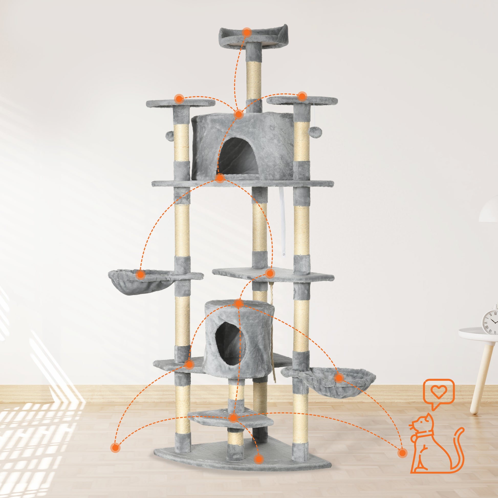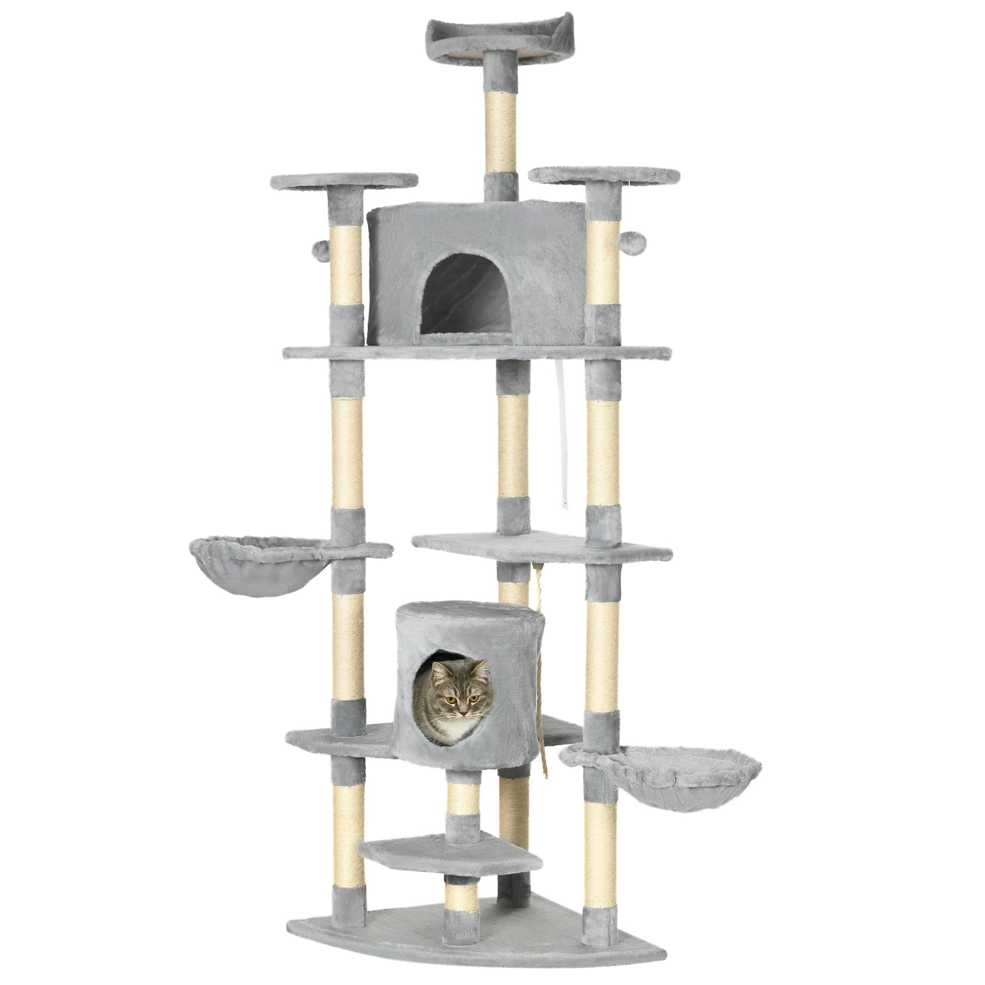 PawHut Kratzbaum mit 2 Hängematten u. 2 Katzenhöhlen inkl. Spielzeug Plüsch Sisalseil Hellgrau