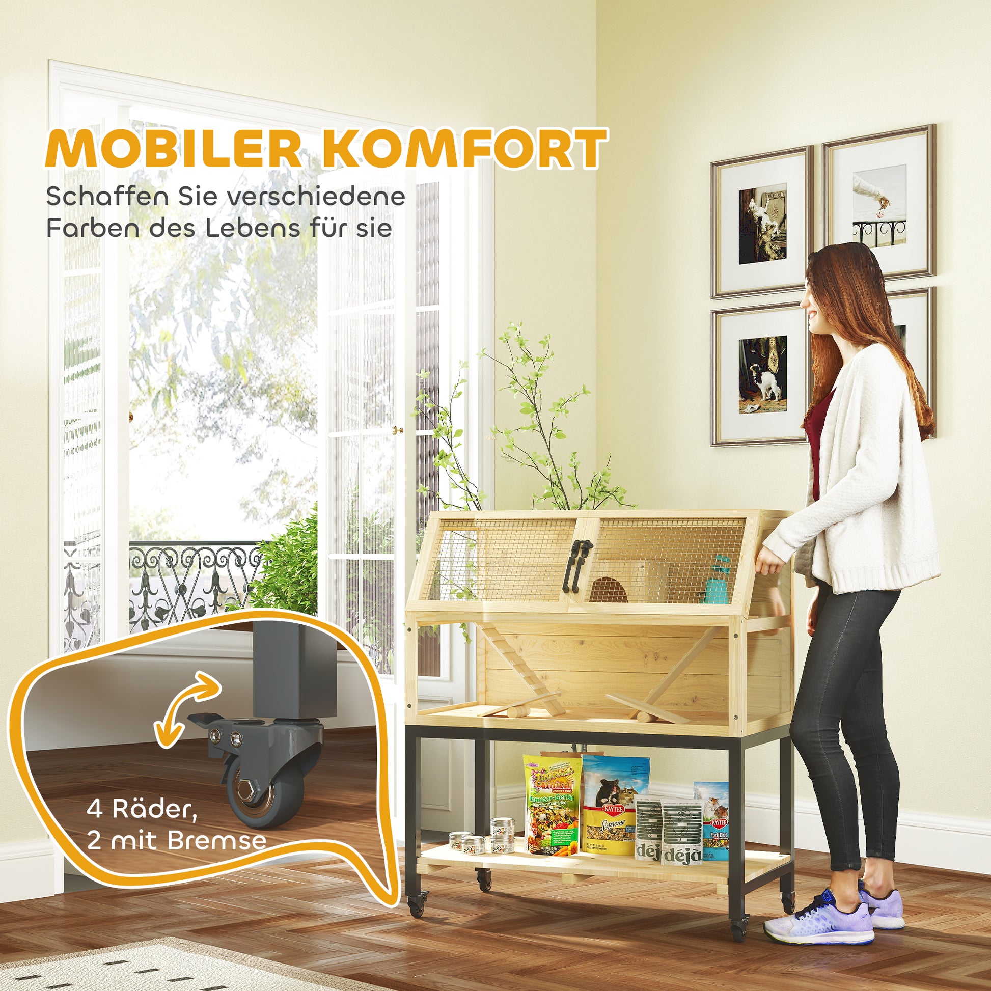 PawHut Zwerghamsterkäfig aus Holz mit Ablagefach, Rädern, Rampen, Wasserflasche, Hütte, Wippen, 87 x 43 x 101cm