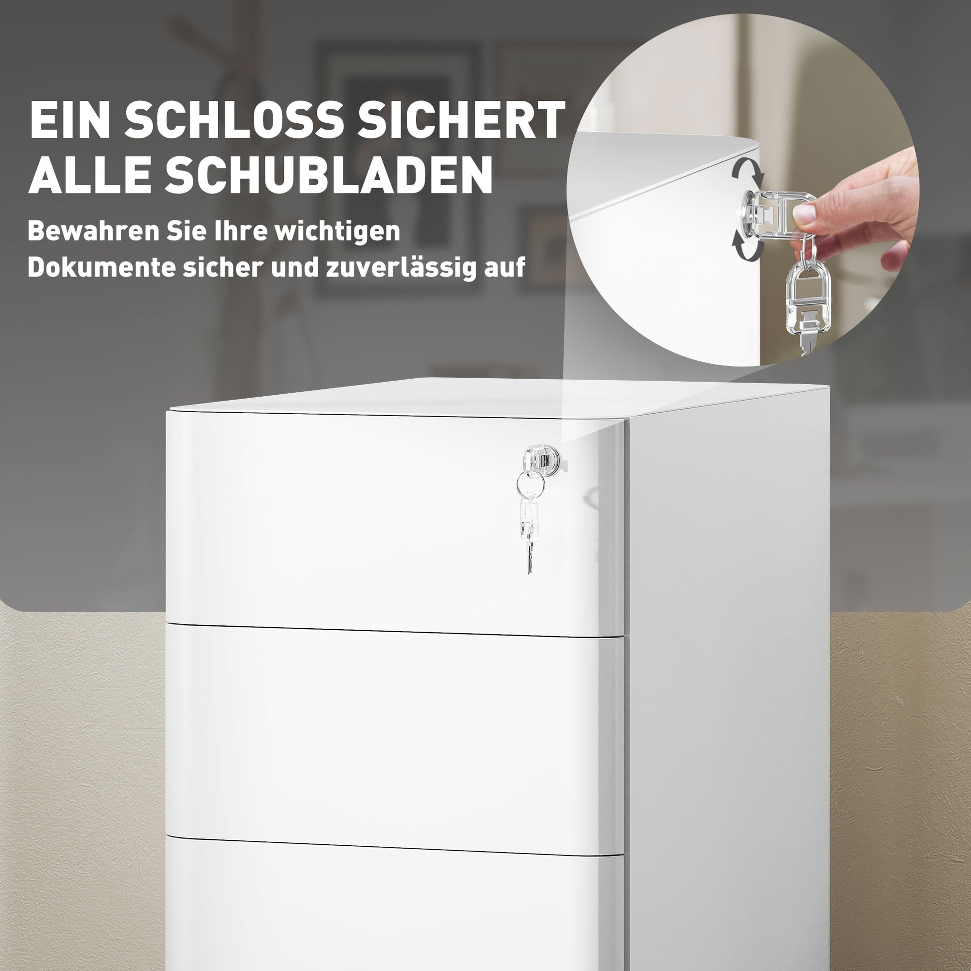 - ✔ Zentralschloss sichert alla Schubladen, um sensible Dokumente zu schützen, två Schlüssel sind inklusive