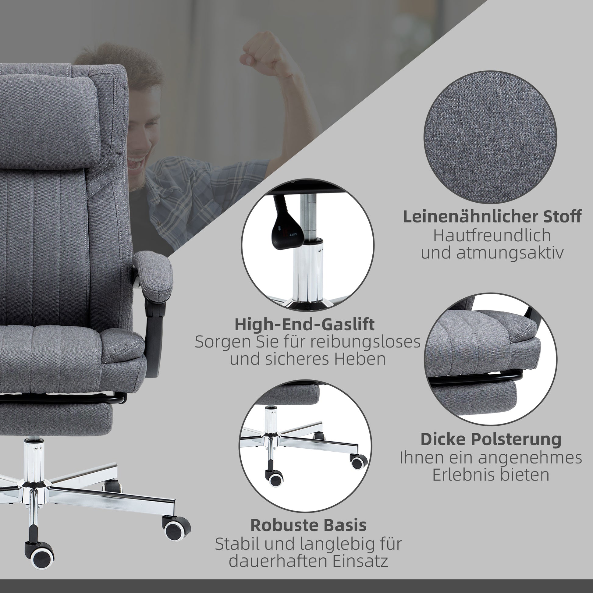 Vinsetto Bürostuhl med Massagefunktion, Neigbar Rücklehne, ausziehbare Fußstütze, Leinenoptik, grå, 65 x 61 x 113 cm
