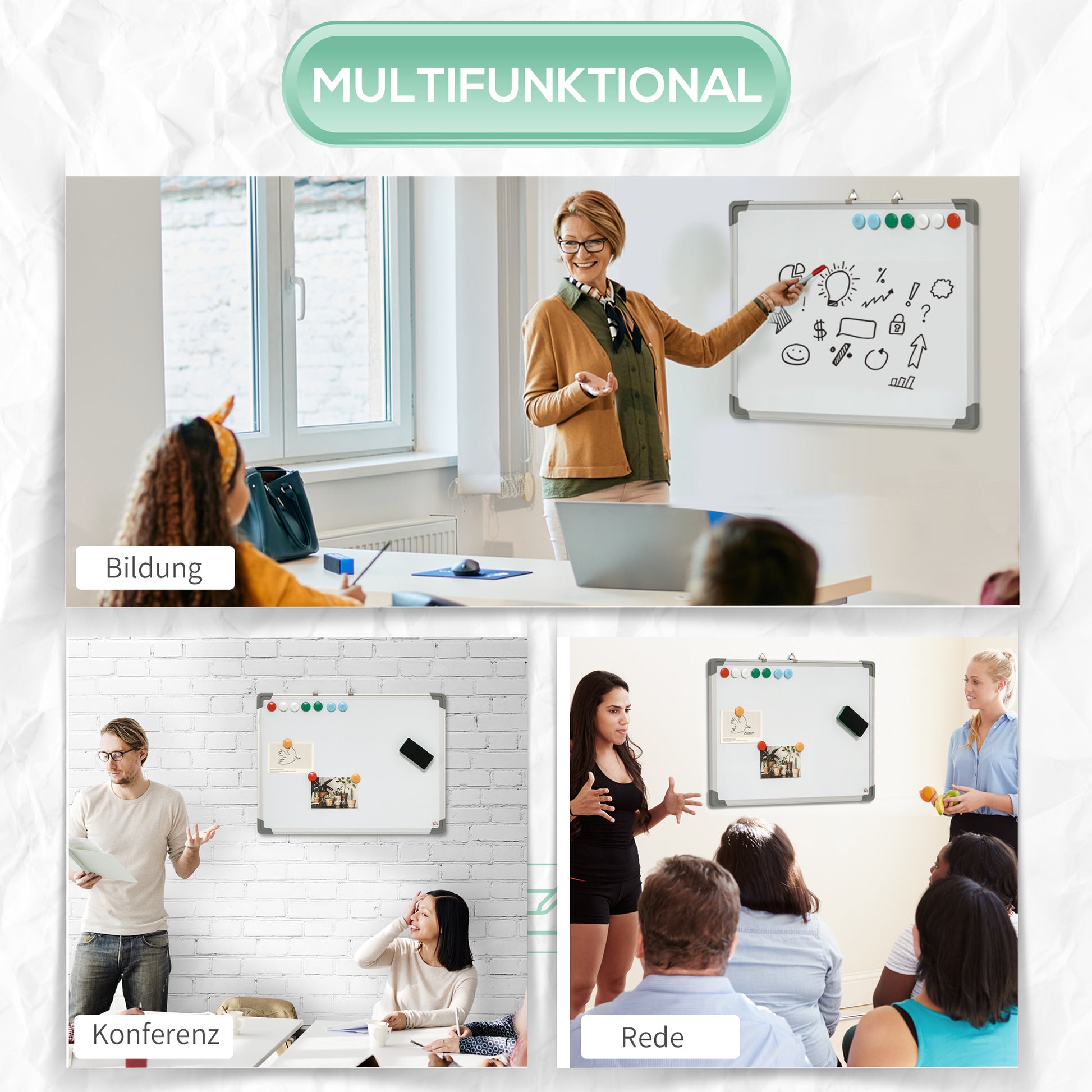 Dieses Whiteboard von HOMCOM ist ideal für den Gebrauch zu Hause oder im Büro geeignet. Es ist mit Kunststoffecken ausgestattet, um Verletzungen zu vermeiden. Mithilfe des mitgelieferten Radiergummis können Sie die Tafel bequem und sauber abwischen. Vier Marker sind im Lieferumfang enthalten; mit jedem Stift können Sie bis zu 1000 Wörter schreiben. Testen Sie unser Whiteboard und machen Sie Ihre Arbeit effizienter!