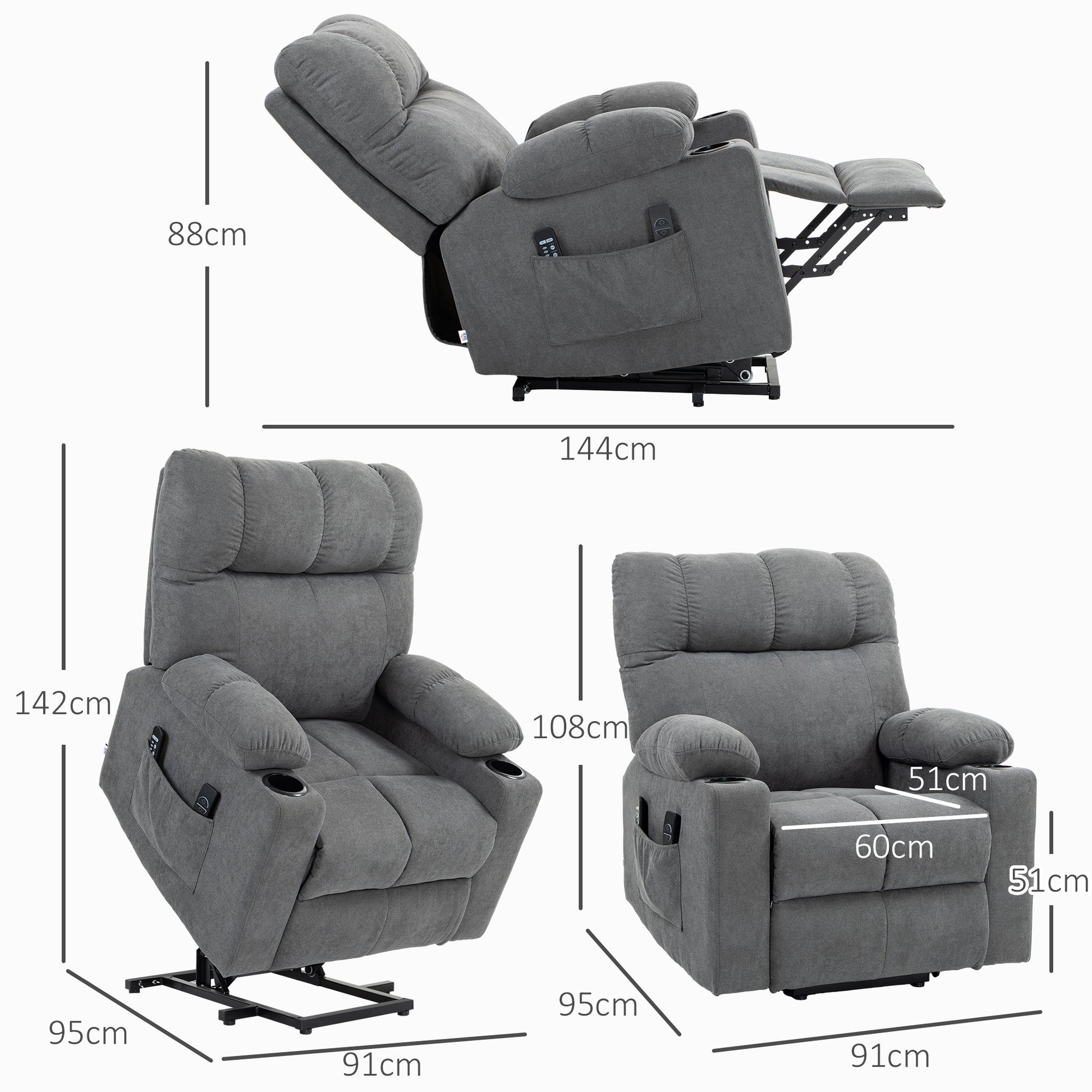 HOMCOM Aufstehhilfe Seniorensessel, Liegefunktion, inkl. Fernbedienung, 144 cm x 91 cm x 88 cm, Grau