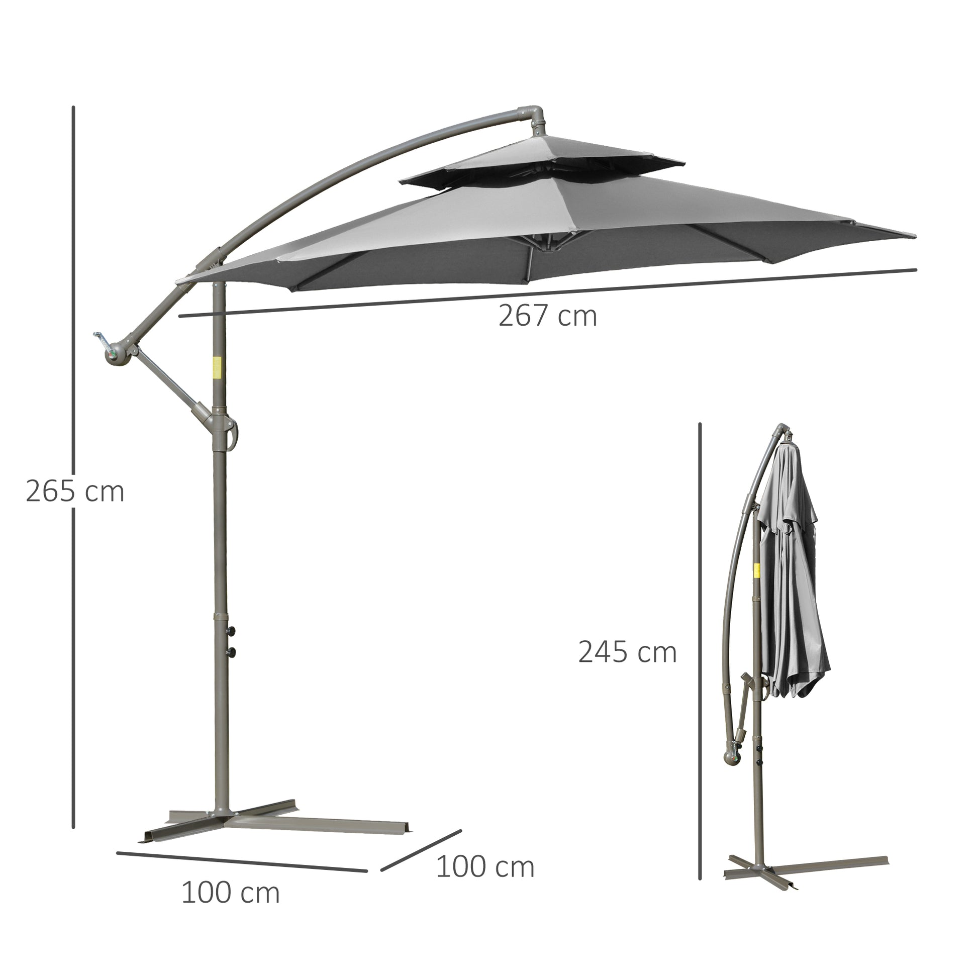 Outsunny Sonnenschirm Ampelschirm Ø2,67 x 2,45 m Kurbelschirm mit Doppeldach Kreuzbasis Stahl Outdoor Sonnenschutz Polyester Stahl Hellgrau