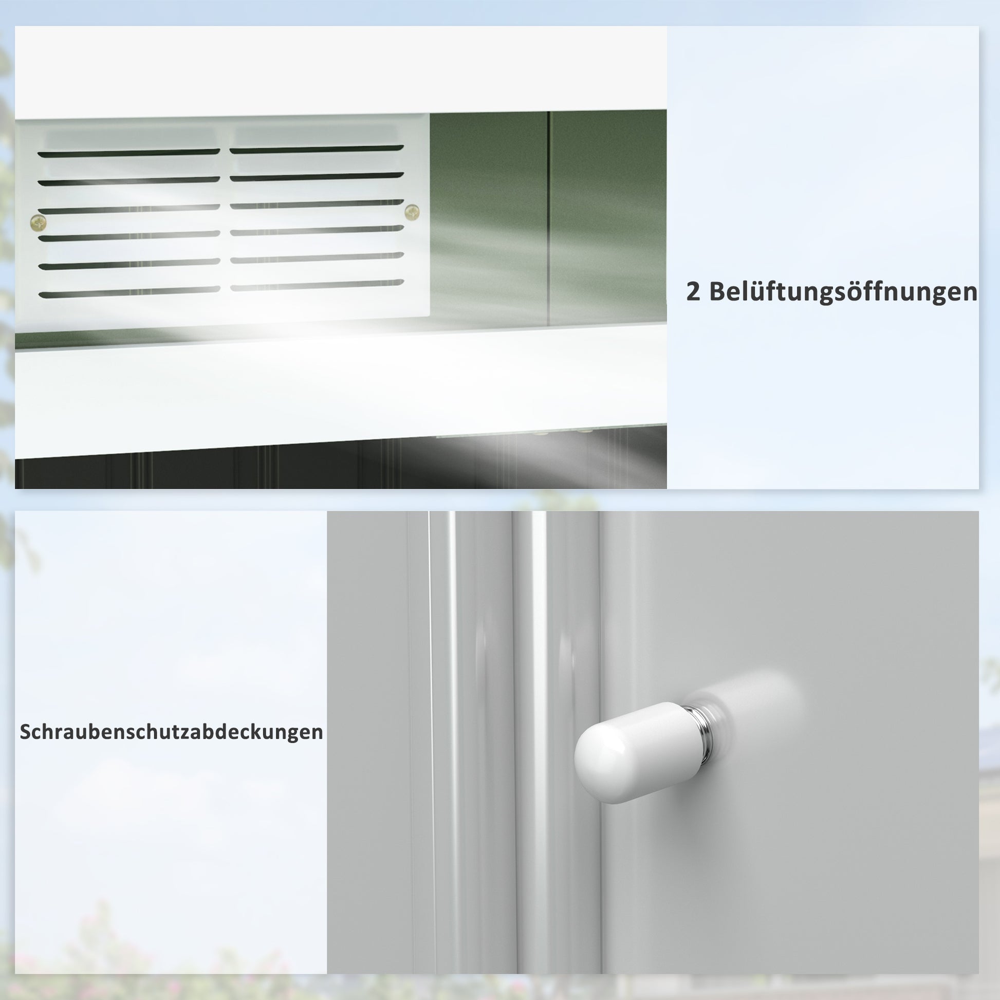 Ob Rasenmäher, Gartenwerkzeuge oder Gartenmöbel - der Geräteschuppen hält alles trocken und sauber. Die solide Konstruktion aus beschichtetem Metall ist wetterbeständig und schmutzabweisend. Die praktischen Schiebetüren ermöglichen jederzeit einen einfachen Zugang ins Innere. Dank der zwei Lüftungsgitter wird der Gartenschuppen gut belüftet, sodass sich keine Feuchtigkeit oder unangenehme Gerüche bilden können. Mit diesem Geräteschuppen von Outsunny fällt Ordnung halten leicht.