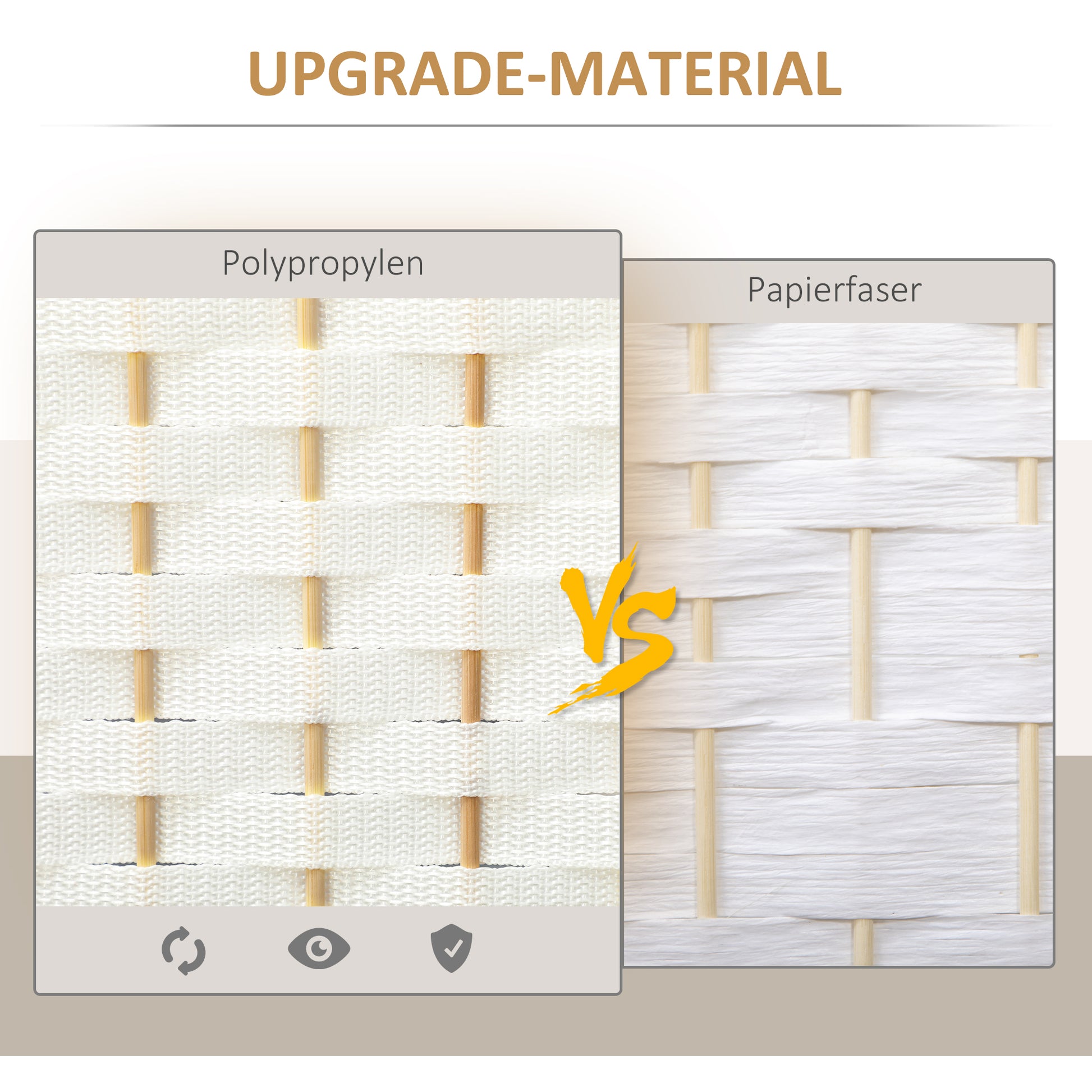 Gestalten Sie Ihre Räumlichkeiten neu mit dem Raumteiler von HOMCOM. Das Polypropylen-Material gewährleistet mehr Privatsphäre und Haltbarkeit als herkömmliche Papierfasern. Die mobile Trennwand kombiniert Stil und Funktionalität mit einem eleganten, sechsteiligen Falt-Design und 15 Metallscharnieren. Der geschwungene Rahmen aus Kiefernholz und das Polypropylen-Gewebe verleihen diesem faltbaren Paravent eine elegante Note.