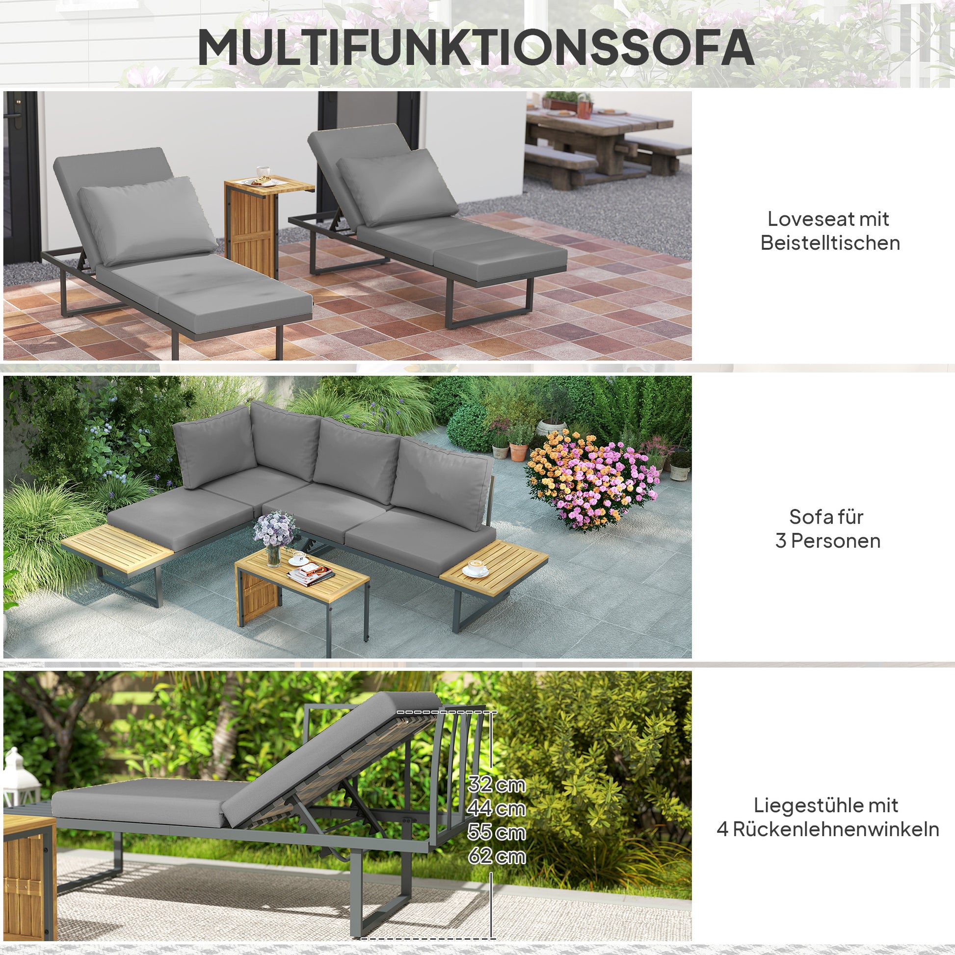 Outsunny Außenmöbel-Set, auf 6 Sitze erweiterbar, L-förmige Outdoor-Sitzecke mit Tischen, Stahlrahmen, verstellbare Lehnen, Grau