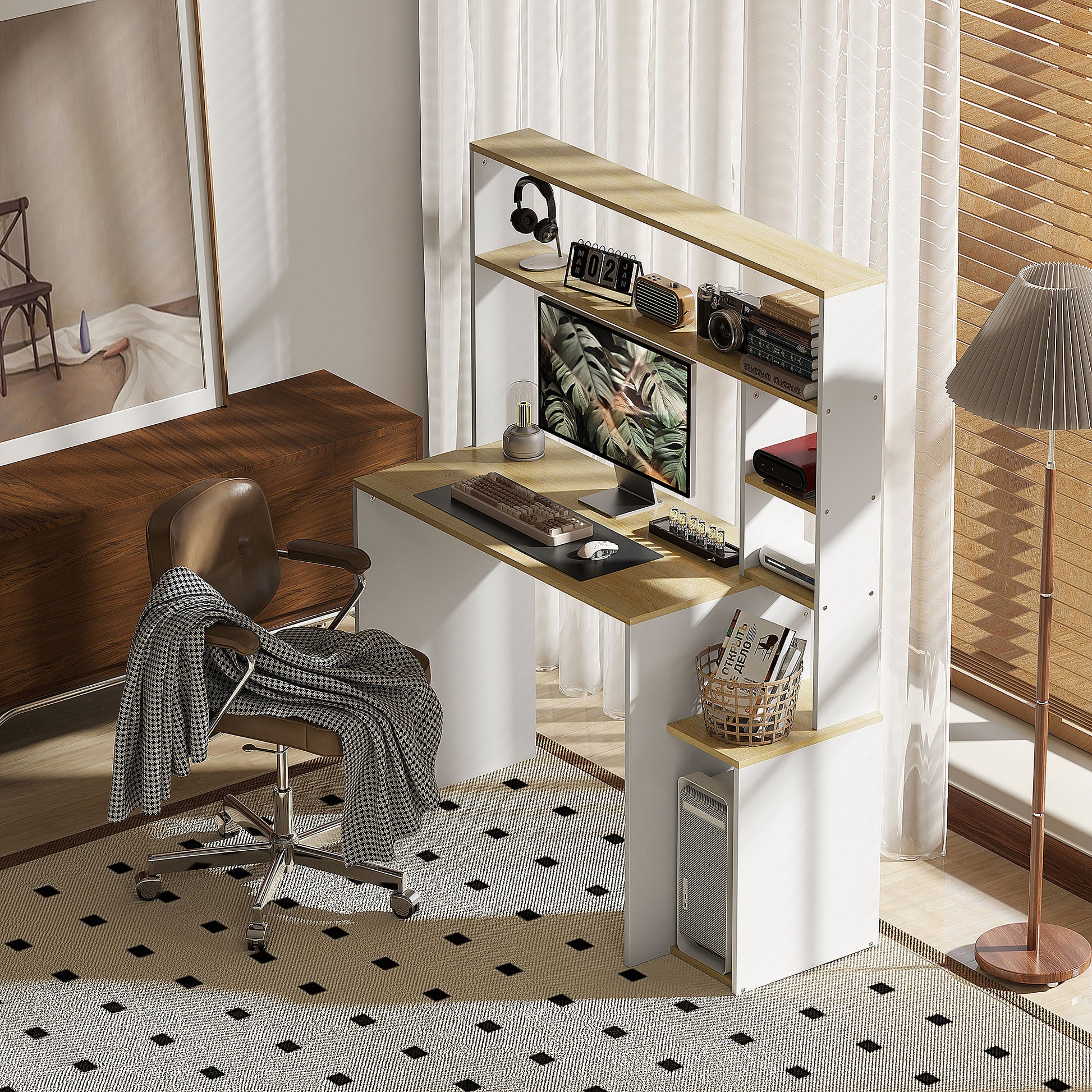 HOMCOM Computertisch, Schreibtisch mit offenen Regalen und Ablagefächern, aus Stahl, Hellbraun+Weiß