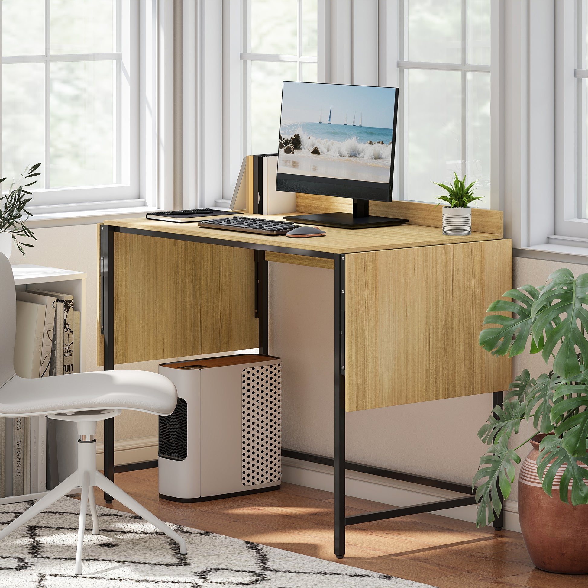 Dank des anpassbaren Klappdesigns dieses Computertisches wechseln Sie spielend zwischen kompaktem und erweitertem Setup. Die großzügige Arbeitsplatte bietet Platz für zwei Monitore und alles Wesentliche, was effektives Multitasking ermöglicht. Der Bürotisch mit Holzoptik und schlichten Metallbeinen bringt modernen Charme in Ihre Räume und fördert Ihre Kreativität.