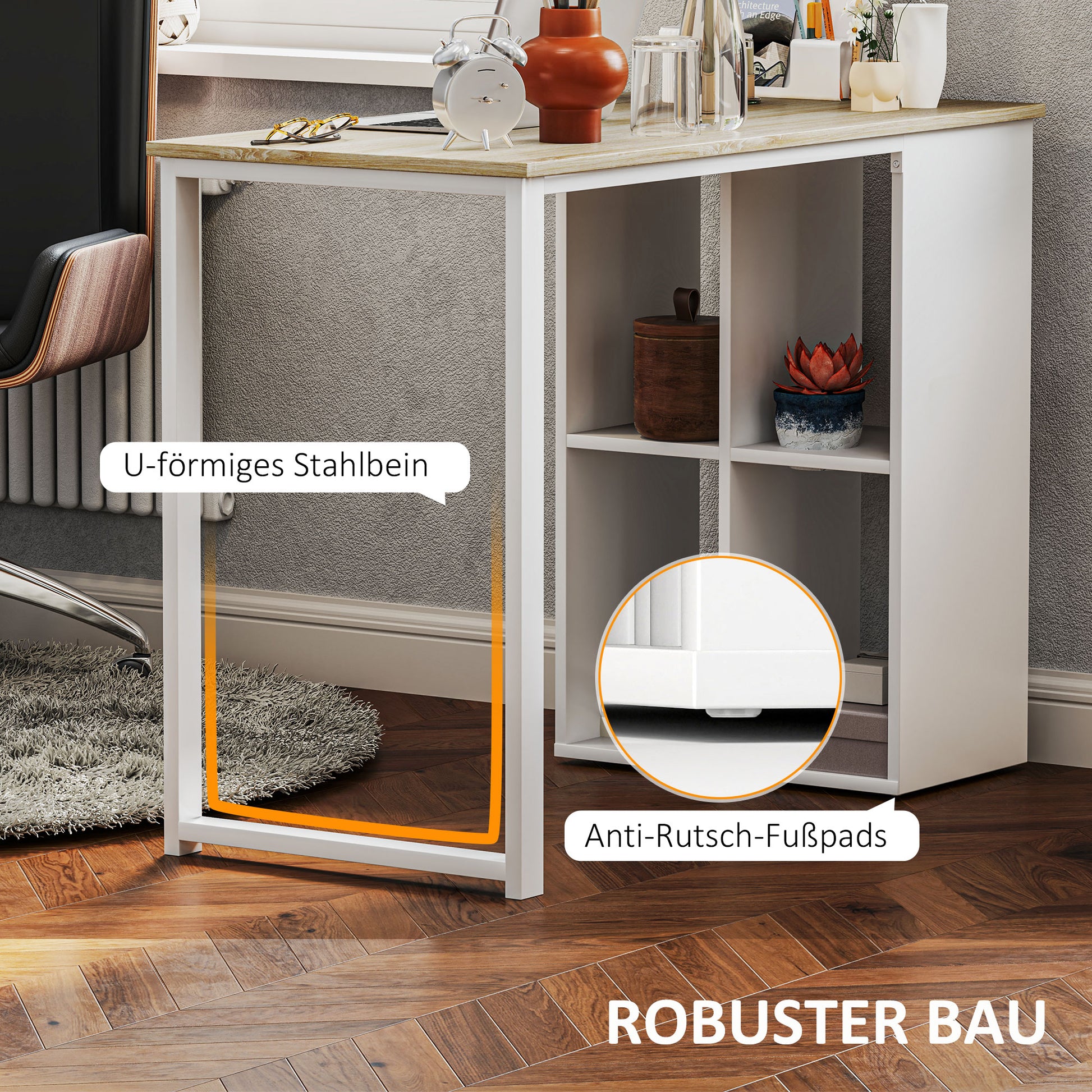 Beleben Sie Ihren Arbeitsplatz mit dem HOMCOM Computertisch, der eine moderne Eichenoberfläche mit einem klaren weißen Finish vereint. Der kompakte Schreibtisch mit den Maßen 100 x 54 cm passt ideal in jedes Homeoffice, Büro oder ein beliebiges Zimmer. Mit vier offenen Fächern für übersichtliches Organisieren und einem hochwertigen Spanplatten- und Stahlrahmen sowie Anti-Rutsch-Fußpads für eine stabile Nutzung.