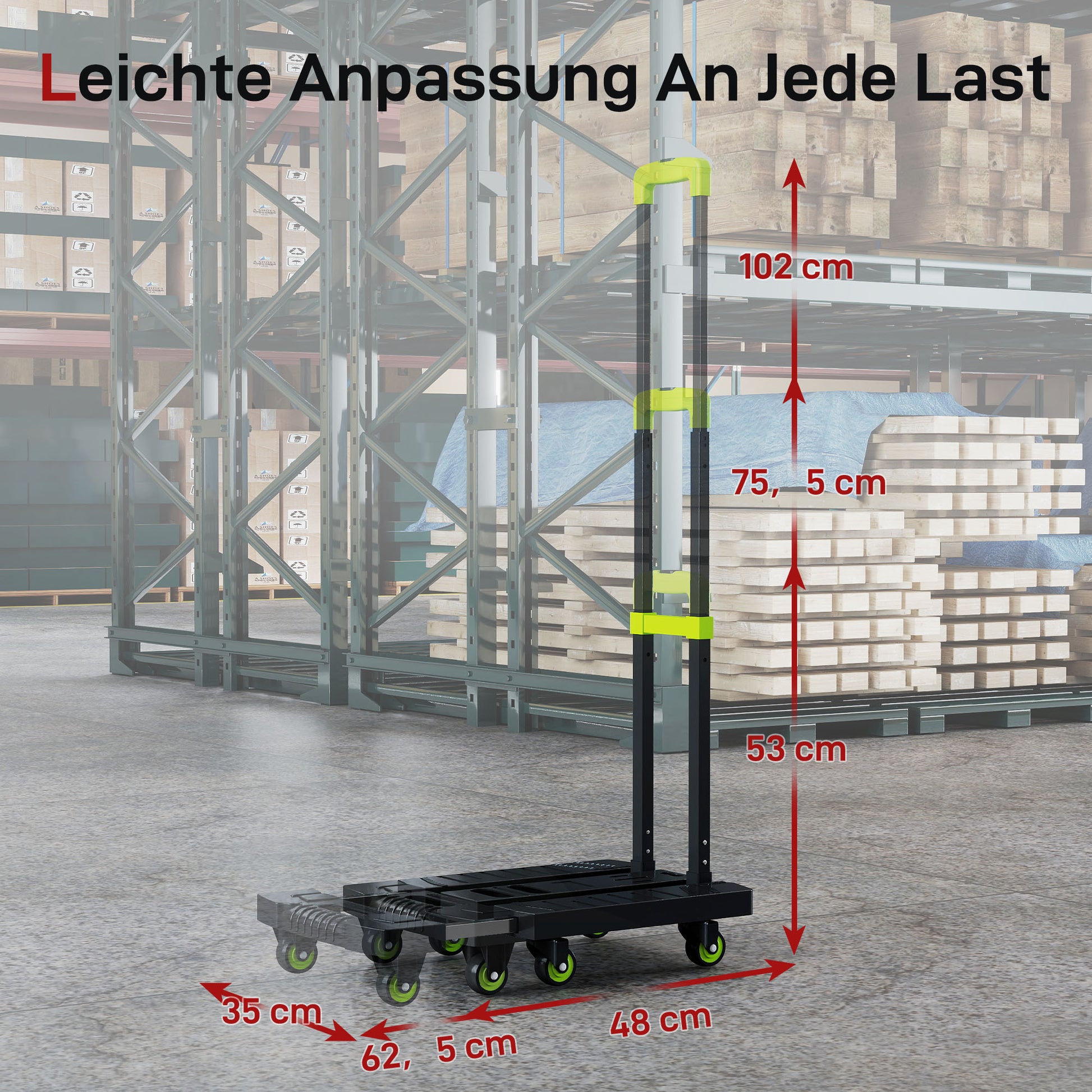 - ✔ Vier lenkbare und zwei feste Räder des klappbaren Transportwagens für sanftes, stabiles Steuern