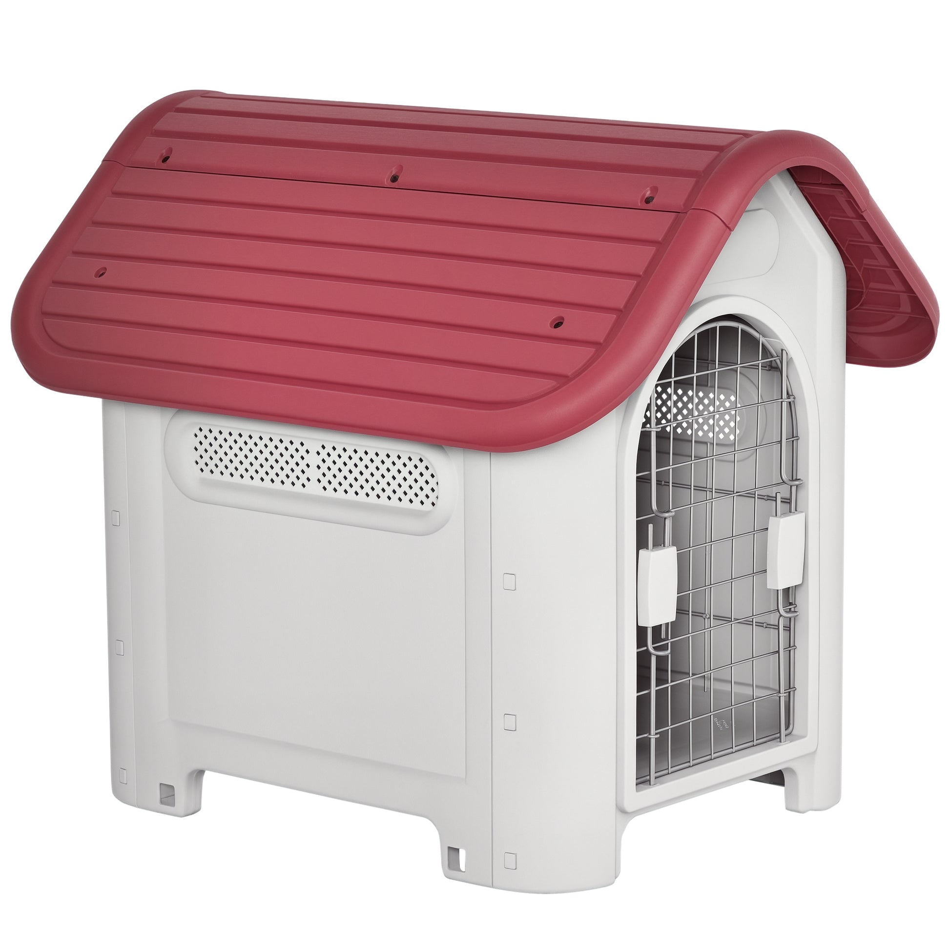 PawHut Hundehütte Outdoor Hundehaus mit Dachluke Tor Unterschlupf für kleine Hunde Kleintierstall Luftzirkulation wasserdicht Metall Kunststoff Rot+Hellgrau 59 x 75 x 66 cm