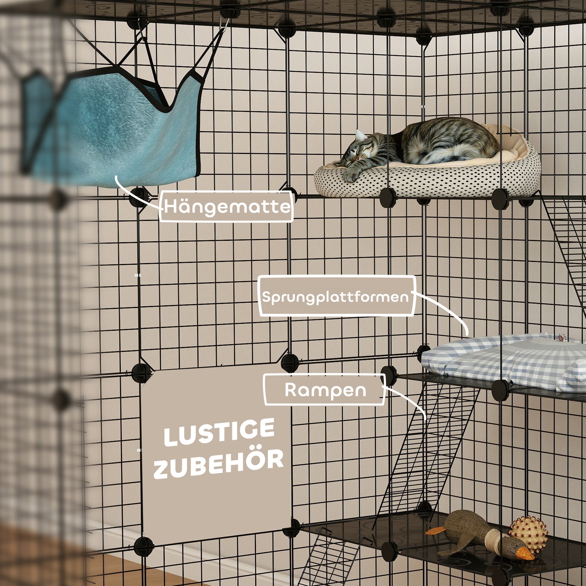 PawHut Katzenkäfig für Drinnen 4-stöckig DIY-Katzengehege mit dichtem Metalldraht Hängematte Rampe Türen Sprungplattformen