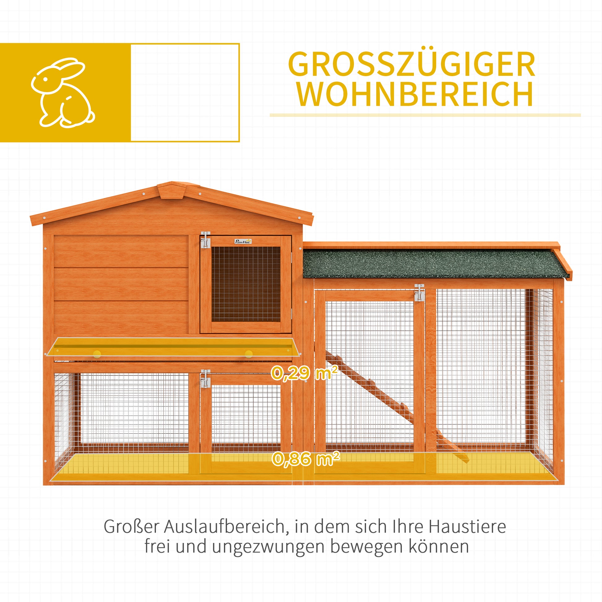 PawHut Kleintierstall, Kleintierkäfig, Outdoor-Kaninchenstall, Freilaufgehege, winterfest, Massivholz, 150 x 45 x 85 cm, Orange
