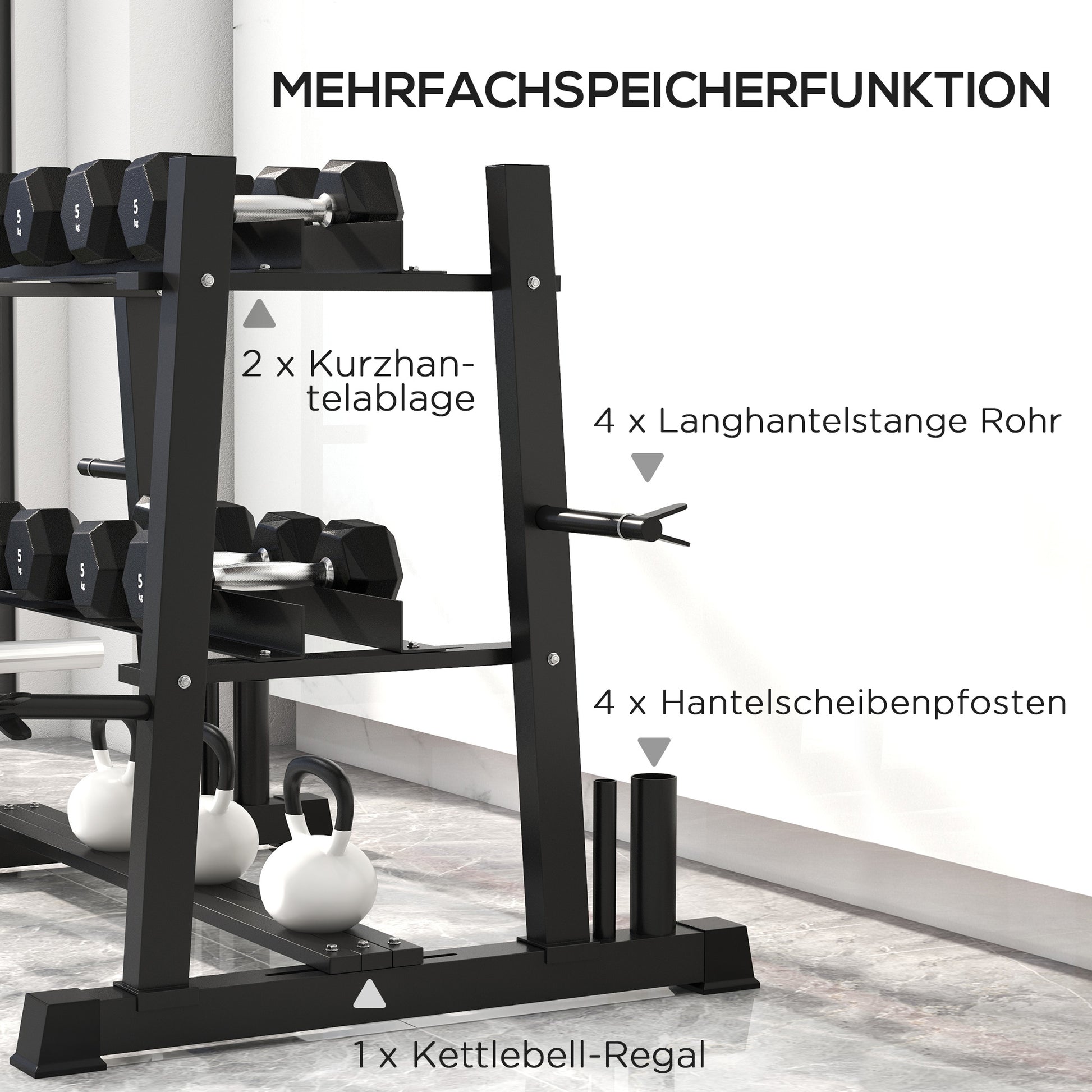 - ✔ Multifunktionaler Gewichtsständer zur Aufbewahrung von Hanteln, Kettlebells, Gewichtsscheiben und Langhantelstangen