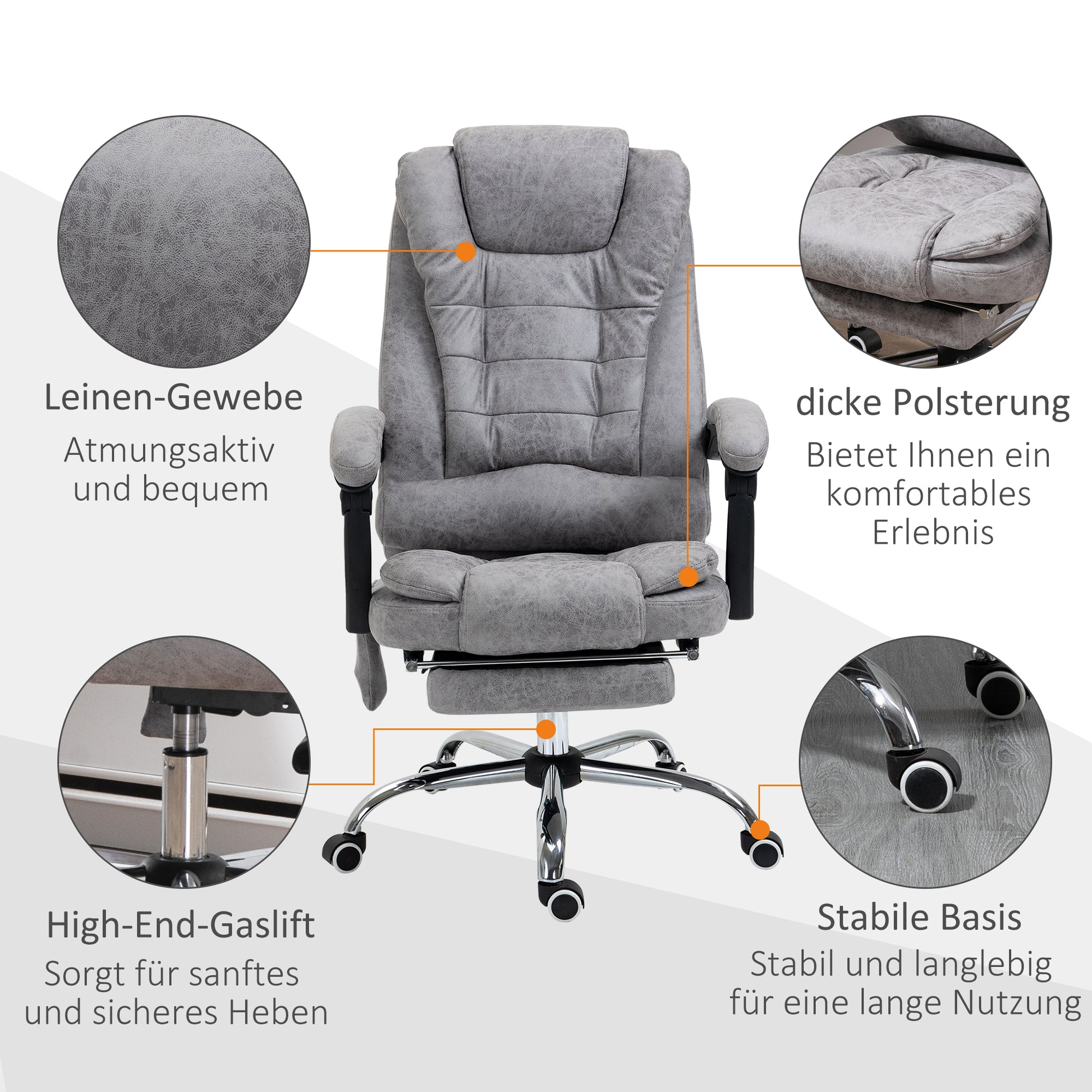 Verwandeln Sie Ihr Büro in eine Oase der Entspannung mit dem Vinsetto Bürostuhl mit Massagefunktion. Dieser Bürosessel ist mit weichem Stoff bezogen und kombiniert stilvollen Komfort mit Funktionalität. Ausgestattet mit Heizfunktion und sechs Massagepunkten, vier im Rücken- und zwei im Sitzbereich, die sich einfach per Fernbedienung steuern lassen, bietet er optimale Entspannung. Zusätzlich ermöglichen die bis zu 135° neigbare Rückenlehne und die manuelle Fußstütze eine perfekte Liegeposition.