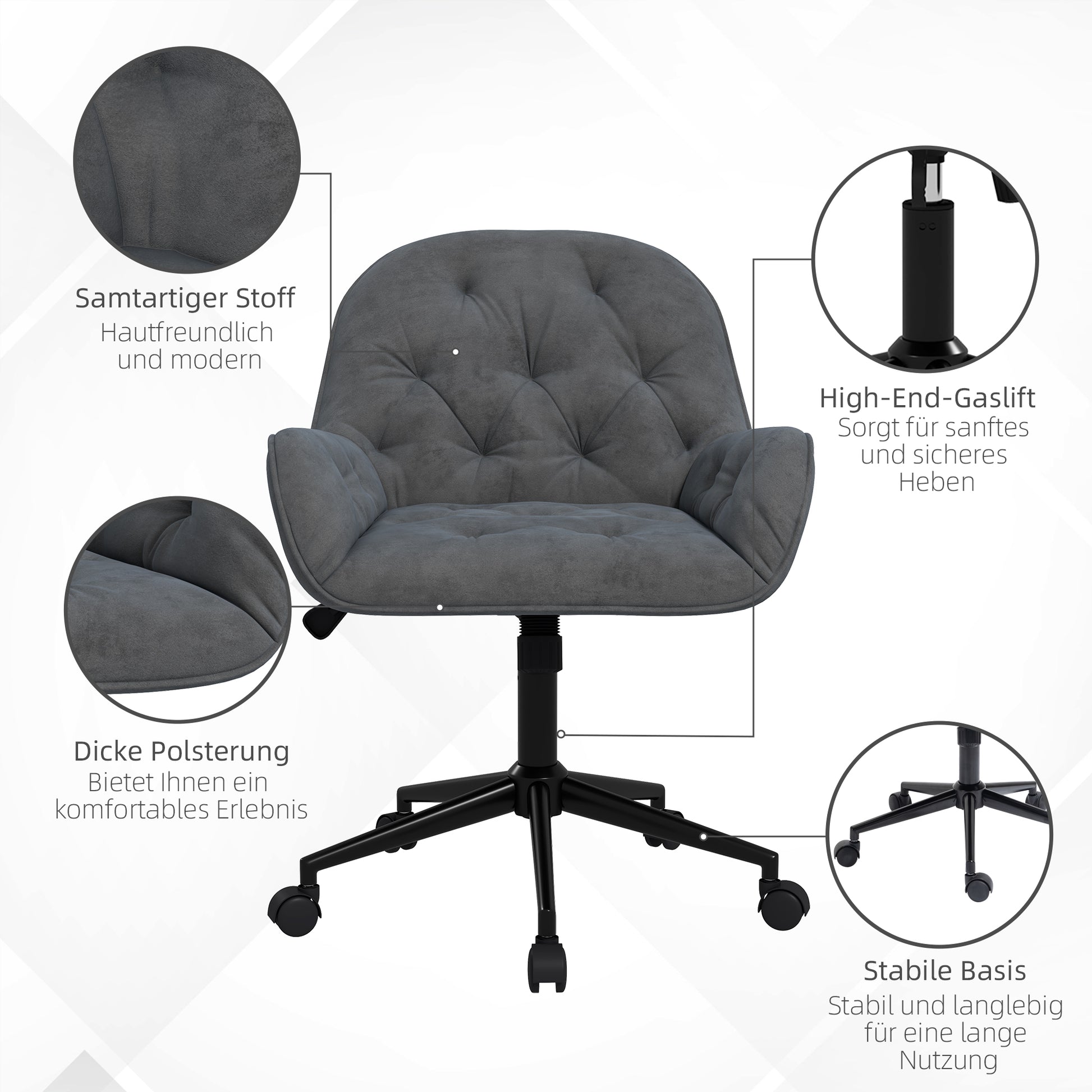 Vinsetto Bürostuhl Schreibtischstuhl Computerstuhl, höhenverstellbar, Samt-Optik, Grau