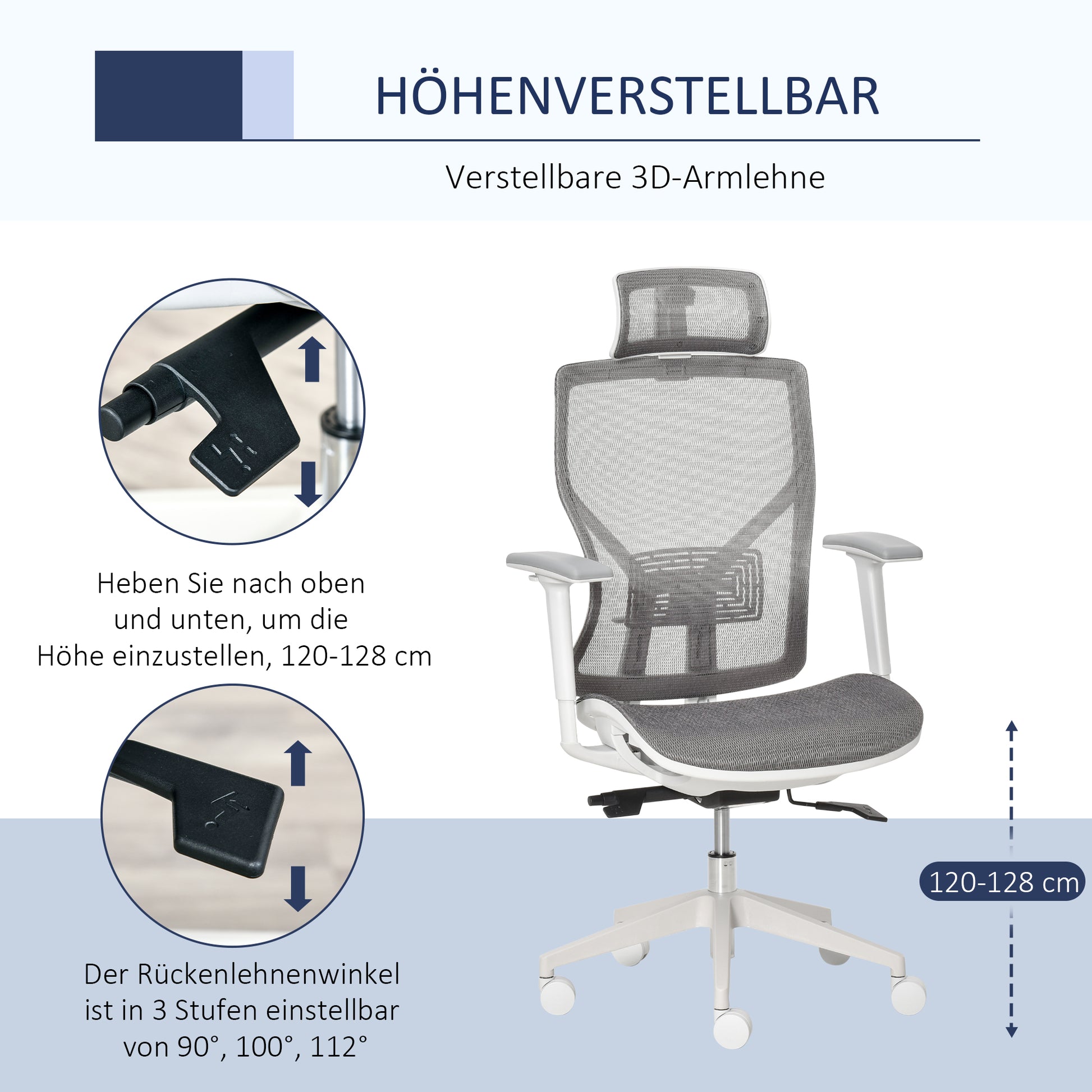 Vinsetto Bürostuhl Schreibtischstuhl Drehstuhl Gamingstuhl mit Kopflehne Lendenkissen 3D-Armlehne 3 Stufen 360°-Drehräder höhenverstellbar ergonomisch Mesh-Stoff Schaumstoff Grau 67 x 65 x 120-128 cm