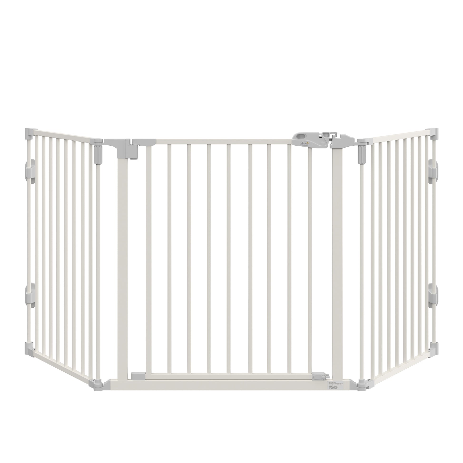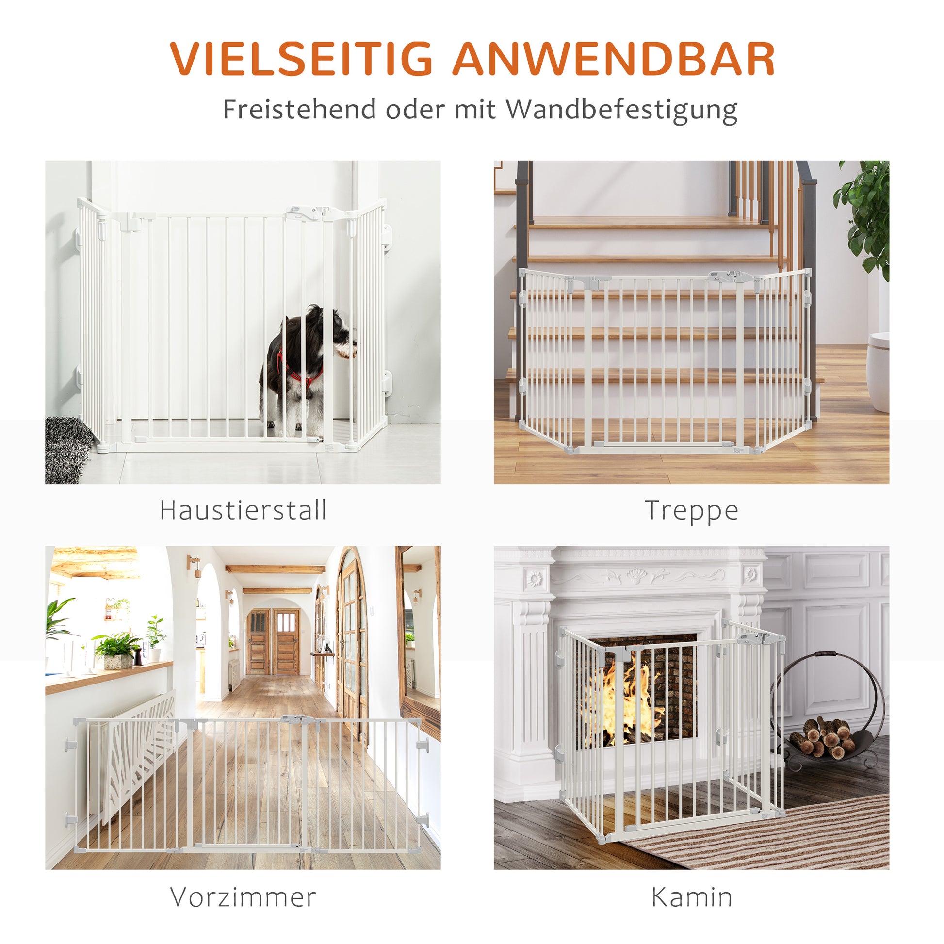 PawHut Hunde Absperrgitter Türschutzgitter Haustierschutzgitter verstellbar klappbar Kamingitter mit automatische schließenden Tür 3 Paneele für Ofen Wandmontage/Freistehend Weiß 202,5 x 76 cm