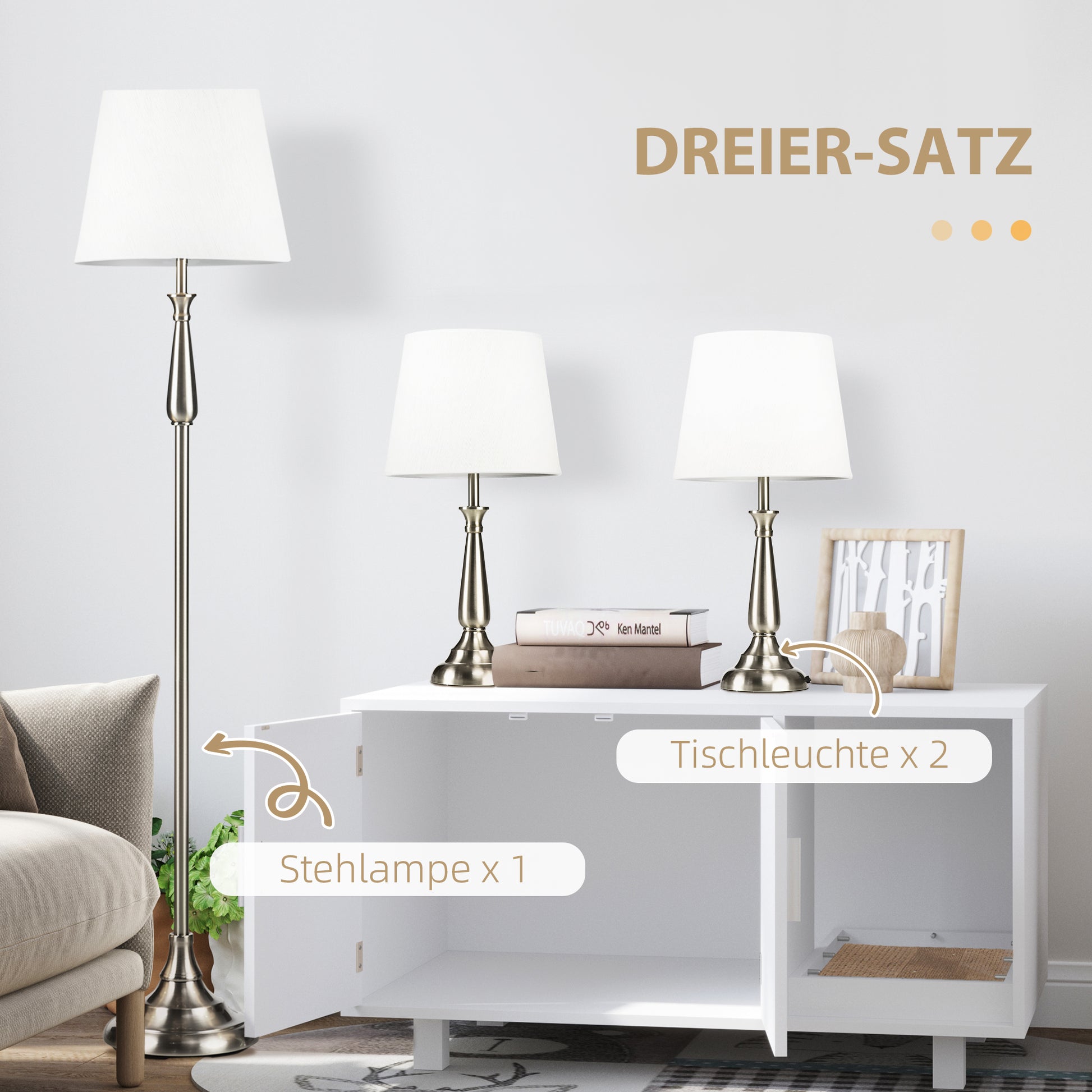 HOMCOM 3-teiliges Lampenset im Vintage-Design, 2 Tischleuchten, 1 Stehleuchte, 35,5 cm x 35,5 cm x 146 cm, Silber + Weiß