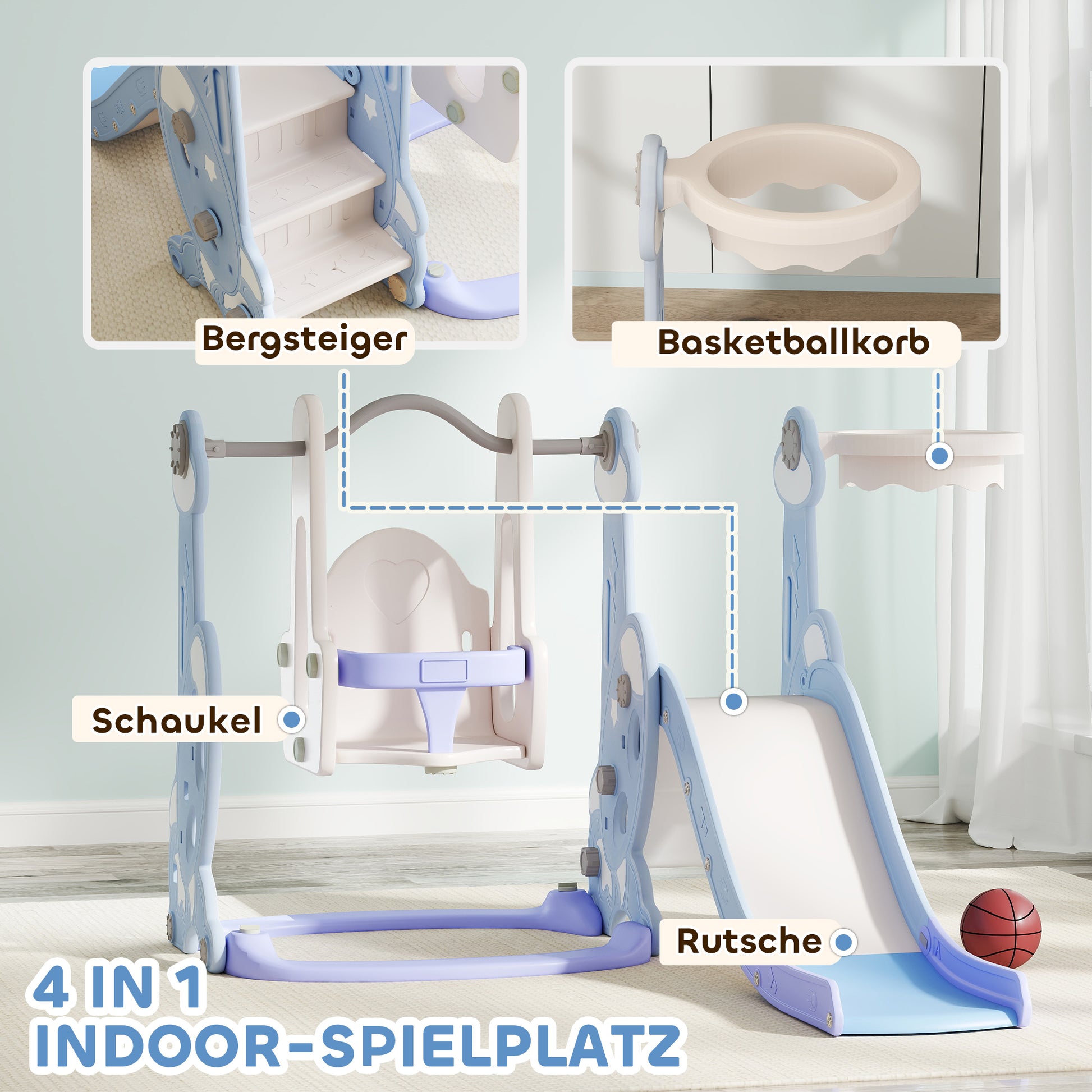 AIYAPLAY 4-in-1 Indoor-Spielplatz, Rutsch- och Schaukelset für Kleinkinder, Basketballkorb, Raketendesign, Kunststoff, Hellblau